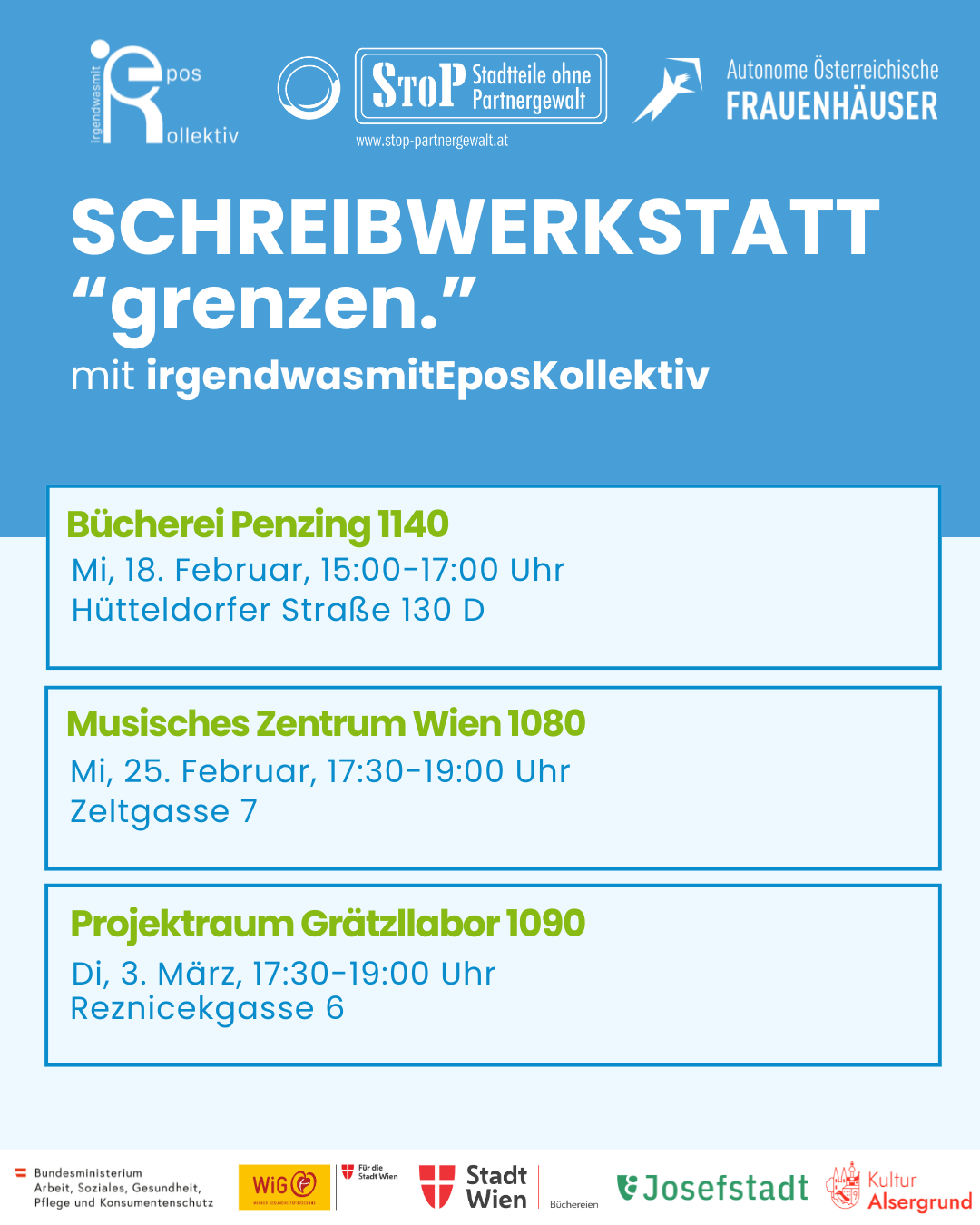Als Grundlage dient unser neues Projekt "grenzen.", welches wir gemeinsam mit StoP auf die Beine stellen. Es wird ein Audiowalk durch die Straßen Wiens über Zivilcourage bei Häuslicher Gewalt.